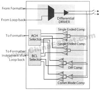 传统的测试利用单边测试通道采用伪差分模式来测试差分通道的被测器件。伪差分模式在差分驱动上的实时性及补偿的不稳定性被充分体现,为保证测试质量只能利用信号的正半或负半。而D-3208选件能够依靠它的真正差分管脚电子性能提高测试真实性。如下图所示: