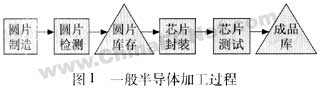 半导体的加工过程主要分为四步(如图1所示):圆片的制造和检测及芯片的封装和测试,其中圆片的制造和检测通常被称为前道工序,主要加工过程包括化学清洗、平面光刻、离子注入、金属沉积/氧化、等离子体/化学刻蚀等,检测完的圆片被送到封装和测试厂进行后道工序的加工、主要加工过程包括贴片、环氧固化、电性能测试、激光刻饰、焊球粘结等,前道和后道工序的加工一般在不同的工厂进行。