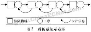 Work-In-Process)系统,物料投放需求信息是随生产线库存状态的改变而传递的。看板系统是被广泛认知的一种拉动式系统,看板系统使用一套卡片来严格控制每两个加工中心的库存,每两个加工中心的卡片数量是预先确定的,卡片数量对应库存数量,系统中总的库存被控制在卡片总数以内,只有当加工中心有排队物料并且持有授权生产的卡片(由下道工序传递来的),该道工序才能开始生产,图1是看板系统示意图,每个卡片授权上道工序生产并传送给下道工序,例如第一和第二道工序间的卡片从被接受加工的批料中腾出后变授权第一道工序前的批料接受工序1的加工,并触发原材料的投放。看板系统保证了较低的库存,各工序只生产后工序所需的物料,避免了不必要的生产,避免和减少了非急需库存。