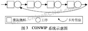 CONWIP系统的核心是建立生产线的库存水平,当实际数量达到或超出该水平时,停止物料投放进入系统,我们称这种协议为CONWIP,因为它规定只有当制成品流出系统时,新的物料才可以投入,这样系统中总的再制品库存接近一个定值(CONstant),如图2所示,CONWIP系统没有规定每两道工序间的卡片数量,只有系统需求且又有卡片授权时,也就是有成品离开系统时,物料就可以投放进入系统,相对看板系统而言,CONWIP系统不控制单独工序前的物料、但系统中总的数量是定常的,一旦原材料授权进入CONWIP"黑匣子"便在系统内自由流动,而且会相对多地自然聚集在瓶颈工序前面。