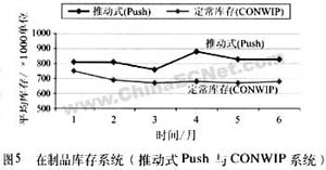CONWIP系统的引进与建立,明显改善了车间生产周期和库存水平,图4显示,采用CONWIP系统后生产周期在六个月内降低了20%,库存同样降低了16%,如图5所示。