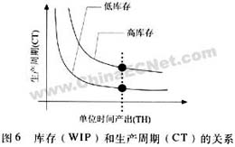 生产周期和库存水平控制是一项重要的生产制造指标,一套好的库存水平系统以及低库存水平可以带来很多好处:首先,确定的标准库存水平可以有效限制物料投放,让订单暂时停留在纸上而不是在车间里,这样可以减少占用宝贵的车间空间,减少质量缺陷和返工率进而带来直接效益,其次,低库存水平相应地缩短生产周期,如图5所示,这是符合利特尔法则。