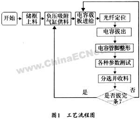 FX-120薄膜电容分选机主要由载料板上料部件、链条传送部件、拔芯部件、电容器整形部件、电容耐压和容量测试部件、分选下料部件等组成,设备采用了PLC控制、中文触摸屏显示界面、凸轮组连动和气动相结合的结构。其工艺流程图如图1。
