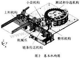首先将载有电容器的载料板放入上料槽中,上料机构带动载料板自动进料并通过气缸吸取、翻转90°后放入链条传送部件,当光纤传感器检测到电容管脚时,拔芯部件动作将电容器从载料板上拔出送入小盘,经两次管脚整形后送入测试分选大盘,在大盘上对电容器进行Co测试,FO飞弧检测、DCTV直流正反向充电耐压测试、ΔC容量及D1损耗测试、最后把电容器分选到相应料框中,图2是基本机构图。