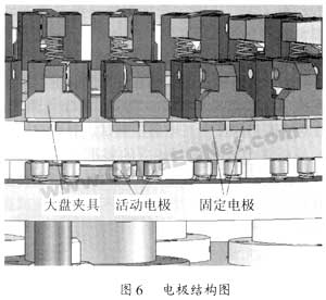 (1)高压测试上采用活动电极和固定电极相配合的独特测试结构,铜电极压紧测试,与传统的链条滑动方式相比较,避免了高压拉弧的不足,满足高压测试的要求,图6是电极结构图。